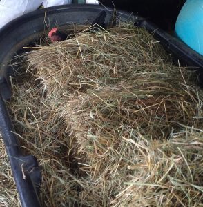 The above picture is one of our chickens hiding in the hay tub I keep in the garage. That tub is supposed to hold the goats’ hay, so that I can easily grab a few flakes on my way outside to feed rather than needing to go all the way to the barn. Half of it is now designated to not one, not two, but four chickens who think it’s cool to jump the netting.
