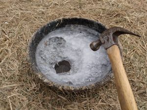 If there is only a small layer of ice on top of the water, I use the hammer.