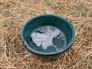 That is really easy with rubber tubs, like shown in the picture above. I do recommend scooping out the ice chunks once you’ve broken them apart. Sometimes, they float to the surface in a perfect formation to prevent animals from drinking. Or, you have a very picky goat who refuses to touch her nose to a chunk of ice if she’s wanting a drink (not that I blame her).