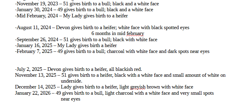 An animal log can be as simple as a word document that lists the date of birth, the cow the calf was born to, and a brief description. Like so: