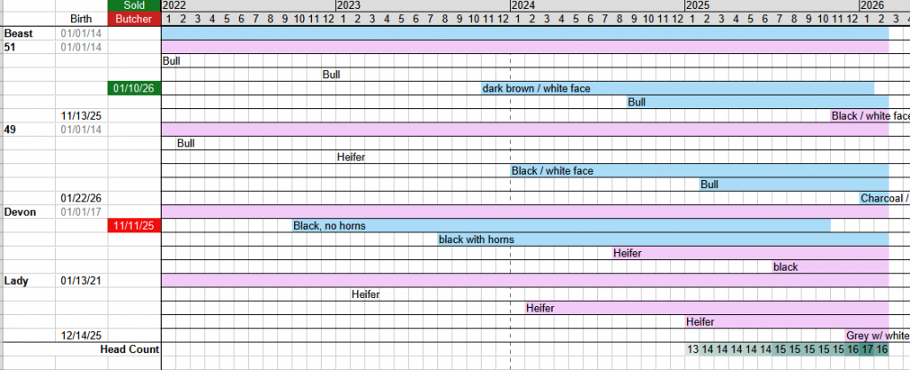 While it was too late to add the remaining three bulls onto the butcher’s schedule, we did decide to go ahead and sell the three younger ones. However, two of those three bulls looked almost identical and we couldn’t tell which bull was which. Luckily, I’d kept a record.