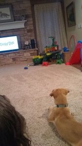What makes fostering such a wonderful opportunity to help with local shelters is the chance to give the animal a break from the shelter while being able to learn what the animal is like in a home setting. At the shelter, there isn’t any real chance to see how the animal will do with different types of animals (like chickens), or how they will handle a crate, and so on. While Coronet was with us, we learned that she loves watching tv!