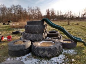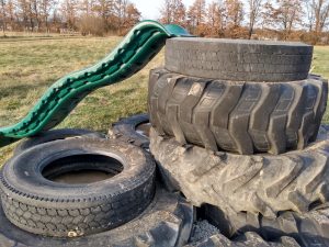 For now, we will keep stacking tractor and semi-truck tires and filling them with sand. All in between of sliding down the slide!