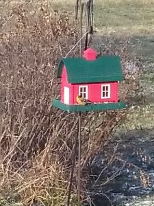 Any, regular bird feeder works wonderfully. This one was so cute, that we decided to go with it. I will add that some birds require special bird feeders. Such as woodpeckers. I haven’t researched this, but according to my dad Baltimore Orioles love grape jelly. I don’t know what kind of bird feeder is needed to be able to serve them grape jelly, but I’m sure there is a special bird feeder for that.