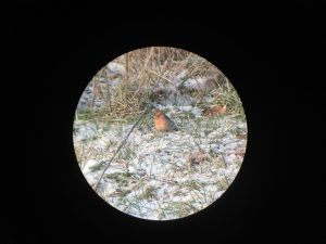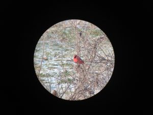 These are pictures of male and female Cardinals as well as House Sparrows. Using a binoculars does make for a cool looking picture. However, in the end we pulled out my old camera and let our daughter have at it with taking pictures of the birds.