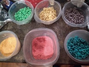 All you need to make this is colored cereal. You can do colored flakes like Fruity Pebbles, but I went with the Fruit Loops style. The large O’s were a lot easier and quicker to sort.