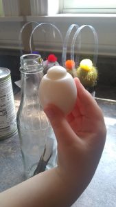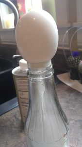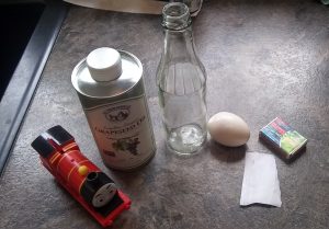 I got so excited when looking through options for science experiments to do with my daughter and found this one. It was an older book without pictures (this becomes important later). Apparently, you are supposed to be able to (in layman’s terms) drop something on fire into the bottle, set the egg on top of the bottle, and the egg gets sucked in.