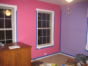 Something about that pink scared me. I don’t know what it was, if it was the darkness of the bare windows at night mixed with that bright of a pink or what. The purple was pretty, though, and I’m very thankful the previous owners left the paint can behind because we did decide to paint another room with the purple.