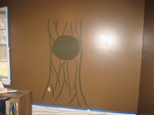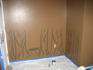 For the craft room, I wanted to do a woodsy theme. First came the chocolate brown, technical color was Oregon Trail, for the walls’ base. I loved the richness of the color. With a pencil, we stenciled in the outline of the trees and used a dark brown to outline the trunks.