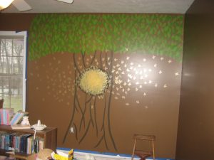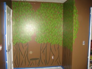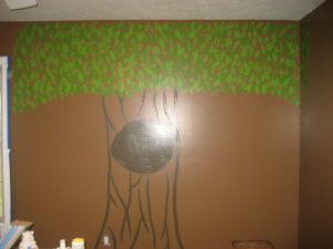 Next, we took two greens that were side by side on the color scale for the leaves. With a foam sponge, we cut a leaf shape and used it to stamp the leaves onto the walls. We alternated light, dark, light to give a three dimensional feel.