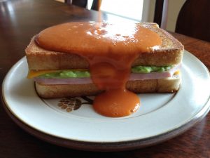 Meanwhile, stack the sandwich together: place one slice of bread on the table, lay a slice of cheese on the bread, next is the slice of ham. Smear the mashed avocado on top of the ham. Top that with the second slice of cheese, followed by the second slice of bread. This whooper is loaded!
